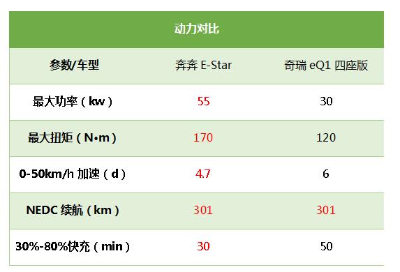 再来对比奇瑞eQ1,30kw的最大功率、120N•m的最大扭矩、0-50km/h最快需要6s,这样的动力水平应对日常通勤虽然够用,但是明显缺少驾驶层面的激情。不过得益于娇小的体型,奇瑞eQ1的NEDC工况续航里程同样达到了301公里。在充电速度方面,奇瑞eQ1 30%-80%快充需要50分钟。在三电比拼环节,奇瑞eQ1明显落后于奔奔E-Star。
