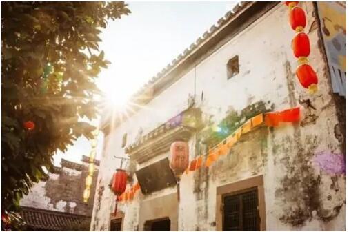 马头墙错落有致,春日暖阳越过屋檐投下旖旎的光。光影婆娑间大红灯笼从高处款款垂落,微风一吹过,流苏跟着起舞。