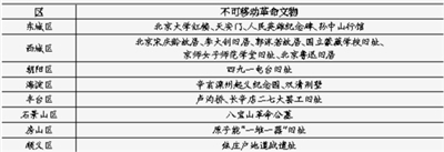 在《北京市第一批革命文物名录》中,不可移动革命文物涉及到各个文保级别。其中全国重点文物保护单位18处,如北京大学红楼、长辛店二七大罢工旧址、人民英雄纪念碑;市级文物保护单位29处,如西城区的湖南会馆、海淀区的贝家花园、大兴区的团河行宫遗址;区级文物保护单位52处,如门头沟区的八路军第四纵队旧址、房山区的良乡烈士陵园、丰台区的赵登禹将军墓;尚未核定公布为文物保护单位的不可移动文物59处,如延庆区的南湾战役遗址及纪念碑、门头沟区马栏村红色革命文物建筑群、通州区二四九炮校旧址。