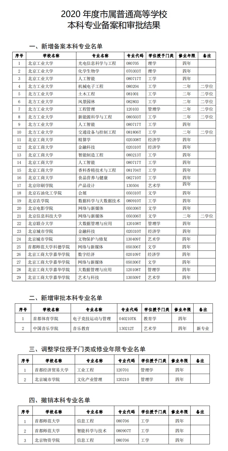 北京市教委近日公布2020年度市属普通高等学校本科专业备案和审批结果。其中,新增备案本科专业29个、新增审批本科专业2个。市教委明确,各高校将充分利用现有办学条件,加强新增本科专业建设。