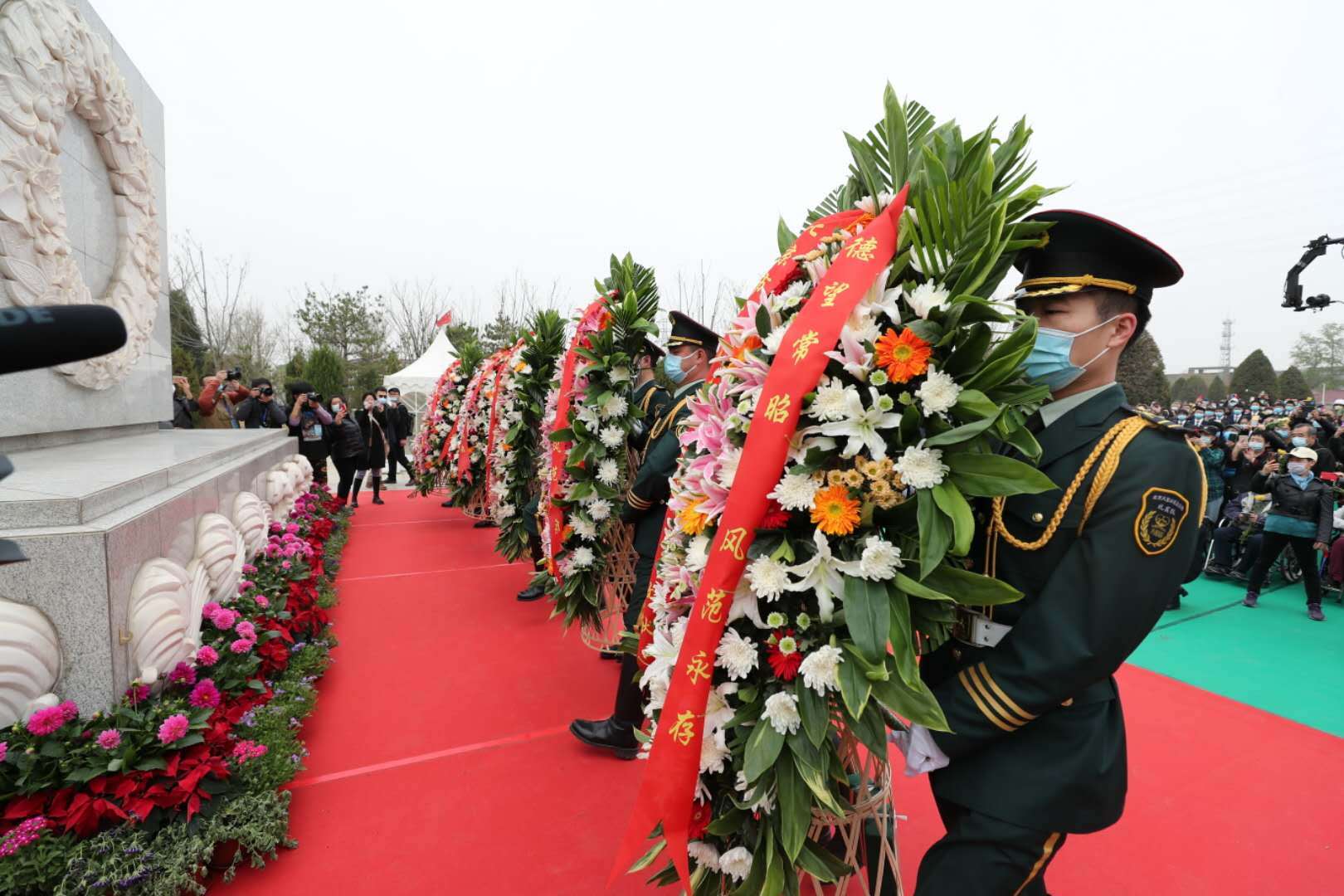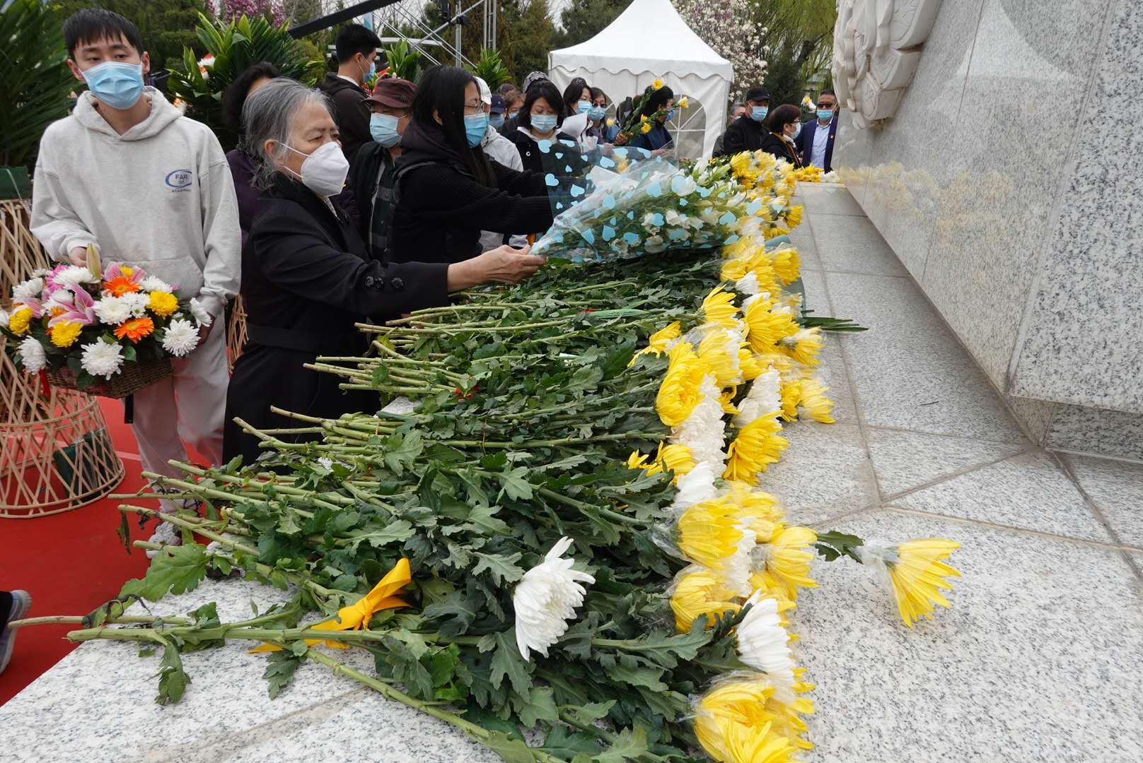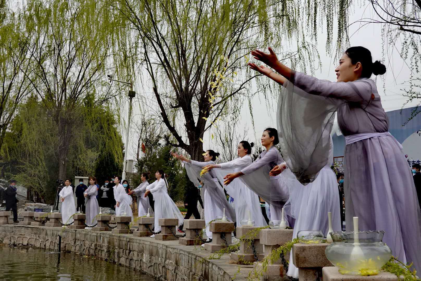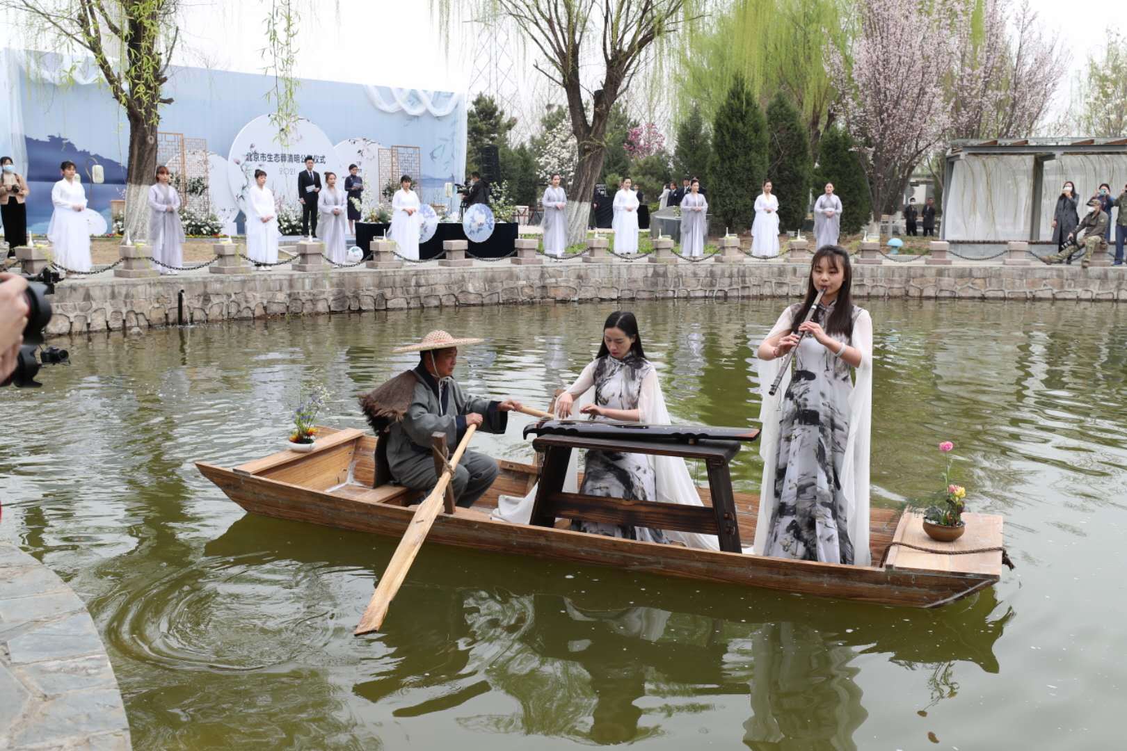 在工作人员的引导下,人们来到纪念碑南侧的湖边。杨柳依依,轻舟荡漾,10位身着素衣的礼祭人员缓缓入场,手持杨柳新枝,将寄托思念的花瓣轻轻撒入湖中。