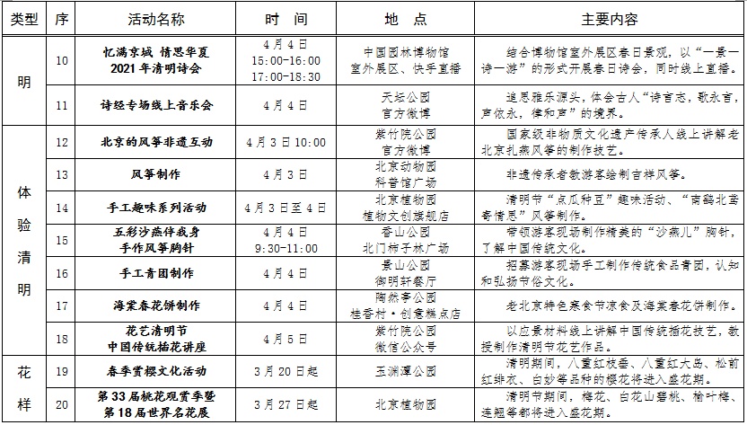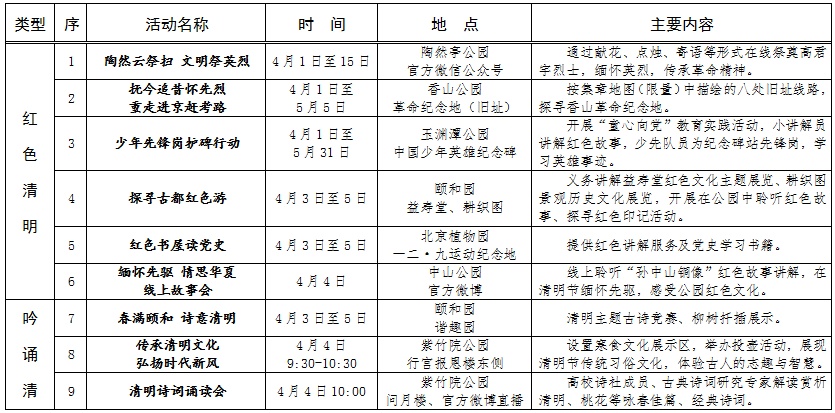 清明假期,颐和园、紫竹院、天坛公园及中国园林博物馆将在线上、线下举办多场诗会、音乐会,将中华民族传统节日与春日园林景观以吟、诵、唱等形式生动呈现,游客可以通过公园官方自媒体直播参与互动。