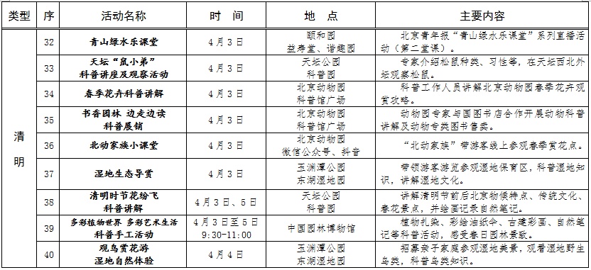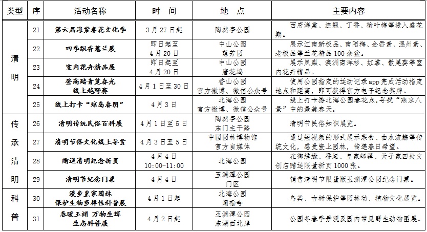 市属公园还将开展清明节俗文化展示活动。陶然亭公园《清明传统民俗百科展》、中国园林博物馆《清明节俗文化导赏》以线下+线上的方式,展示踏青、植树、寒食、射柳的中国传统习俗,融入春游踏青氛围,传递春日希望。