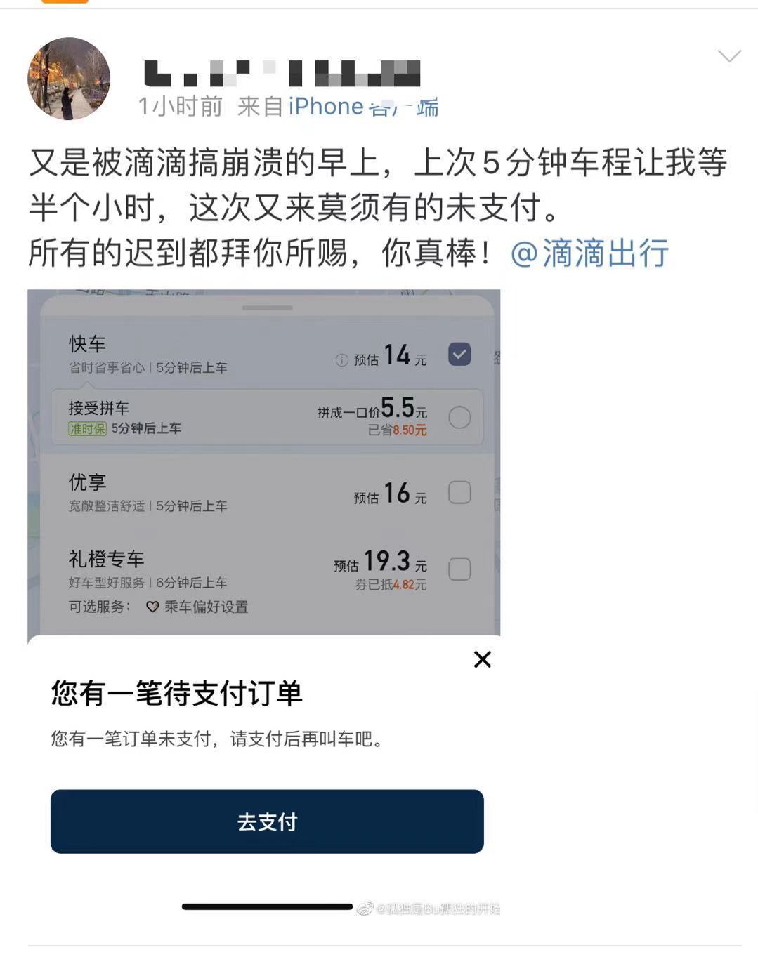“上次五分钟车程等了半个小时,这次又莫名其妙地出现未支付订单”“说我有未支付订单,然而并没有,且无法查询,客服也打不通”“一早上赶高铁打车总显示有订单未支付,试了很多遍都有问题。”……在微博上,多位网友反映自己出现类似问题。