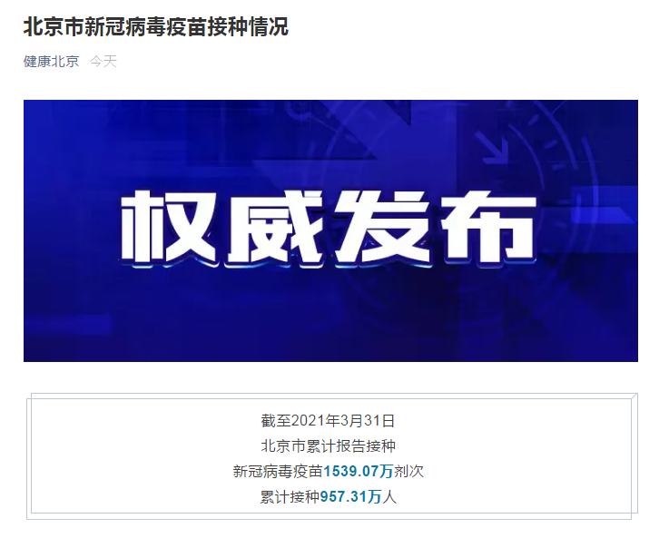 来源标题:截至3月31日,北京累计报告接种新冠疫苗1539.07万剂次
