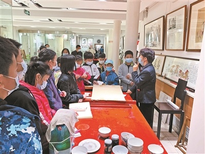 有300多年历史的荣宝斋拥有“木版水印”和“装裱修复”两项国家级非物质文化遗产技艺。“木版水印完全手工印刷,无论是水墨、矿物质颜料色彩都是根据画作的需要来选择进行创作,讲究更多的是韵味、墨趣、创意,这与现在很多机器印刷的高仿画作是完全不一样的。”在荣宝斋木版水印工坊陈铭经理的讲解中,小记者们了解到木版水印的操作过程,“荣宝斋的木版水印全部由手工操作,工艺过程大致需要经过选稿、勾描、刻版、印刷、装裱这五道工序,完成一幅木版水印画作品,少则数月,多则数年。”听着陈经理的详细讲解,同学们还看到了荣宝斋复制的众多作品中水平最高的《韩熙载夜宴图》。“韩熙载的胡髯细若游丝而又刚劲有力,需要四五块套版才能把胡髯繁简、虚实、浓淡的线条层次表现出来。这幅作品用了1667块木版,从筹划开始总共耗费20年时间才制作而成。”