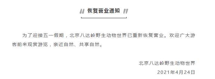 4月24日,北京八达岭野生动物世界在其官微发布消息称,为了迎接五一假期,北京八达岭野生动物世界已重新恢复营业。欢迎广大游客前来观赏游览,亲近自然、共享自然。