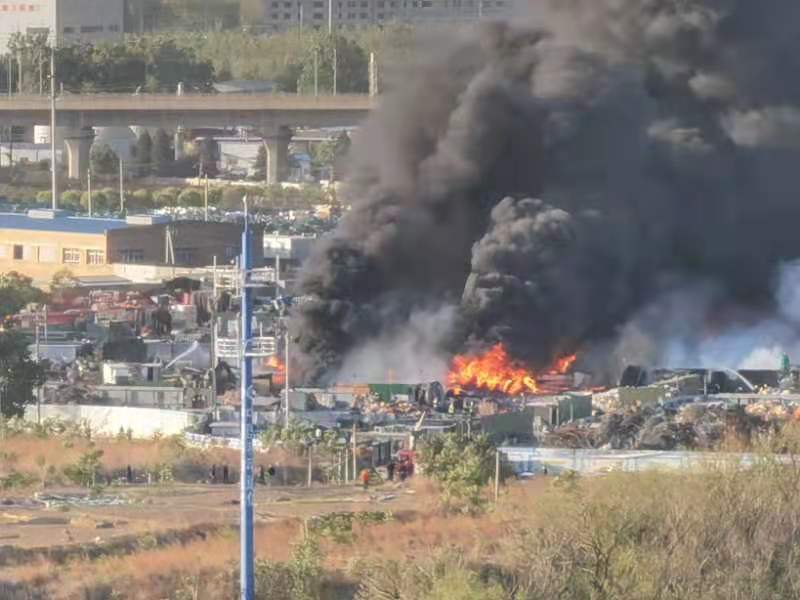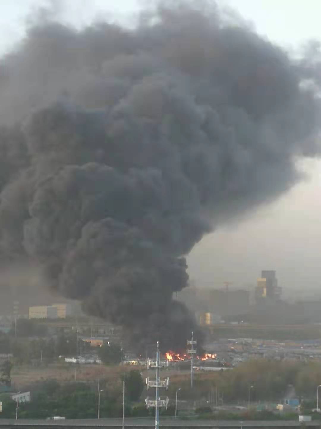在另一位市民拍摄的视频中,在一处被绿色围挡包围的区域内,熊熊大火烧得正烈,黑色浓烟直冲天际,而四周不少消防救援车辆正在向火焰方向喷射水柱。“现在火还在着着呢,今天风太大了!”