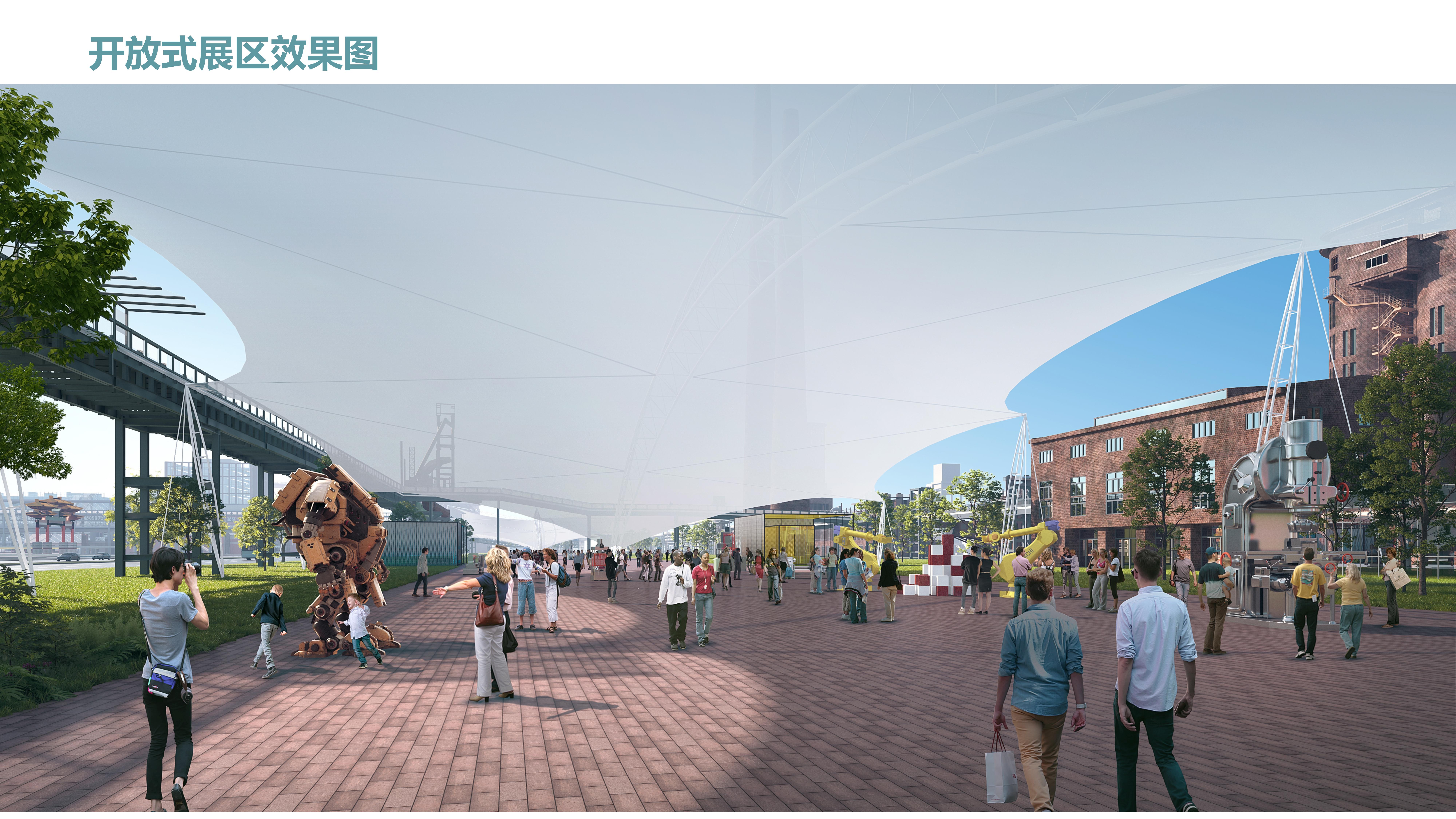 服贸会首钢园区会场以园区北区工业遗址公园为核心,项目规划综合考虑了与奥运场馆、工业遗存及重要景观节点的结合,形成了“三横一纵”景观廊道体系,强调与步行系统结合的视觉体验,主要展区环绕布局,塑造具有强烈城市公园属性的聚落式会展,打造独一无二的北京服贸会文化品牌。