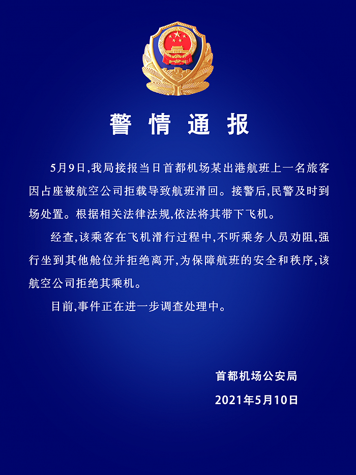 新京报快讯 5月10日,据“首都机场公安”微信公众号消息,5月9日,首都机场公安局接报当日首都机场某出港航班上一名旅客因占座被航空公司拒载导致航班滑回。接警后,民警及时到场处置。根据相关法律法规,依法将其带下飞机。
