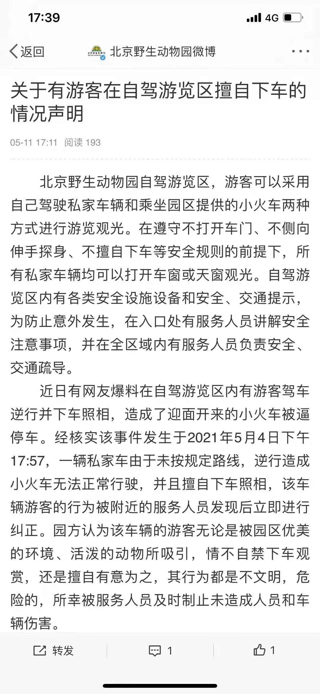 网传“游客驾车逆行还逼停小火车”,北京野生动物园通报详情