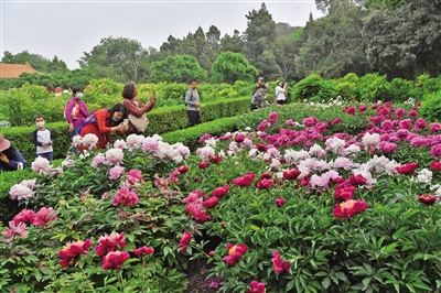 5月13日傍晚,景山公园东门内,游客在欣赏盛开的芍药花。今年,景山公园汇集了318种、两万余墩的芍药,其中国内芍药167种,进口品种芍药151种,品种、数量均为历年之最。