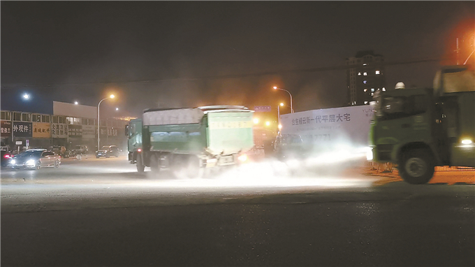 5月12日晚7时许,记者在现场看到,包括渣土车、水泥罐车在内的不少大型车辆正在该路段往来穿行。由于路口路面坑坑洼洼,加之满载的渣土车存在苫盖不严的情况,当车辆经过坑洼处发生颠簸后,渣土便顺着车身撒落。每当后续有大型车辆经过,整个路口处便会尘土飞扬,甚至连停靠在路侧的车辆车身也被尘土盖满。