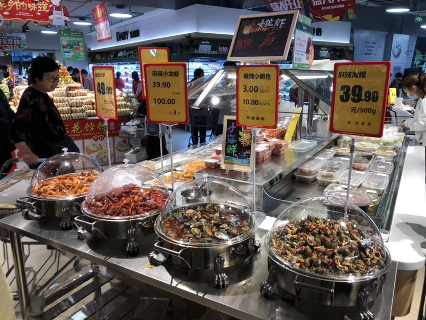主食区域分为大大小小十余个柜台,海鲜柜台里有麻辣田螺、麻辣龙虾尾、麻辣生蟹钳等十多种海鲜小菜;炒菜柜台里有小笼包和炒面等主食、凉拌时蔬、酱肉烧鸡等各类熟食,以及荤素搭配的盒饭;寿司柜台前,五彩缤纷的各式寿司吸引着不少年轻消费者挑选。