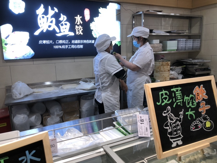 “水饺全都是我们当天在这现包的,有鲅鱼馅、牛肉馅、羊肉馅等好几种,一份18个,价格都在二三十元左右。买回家可以直接下锅,也可以在我们这里买现场煮好的水饺。”现场工作人员介绍说。