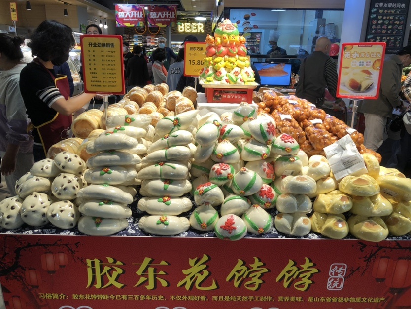 在位于常营地区的家家悦超市里,现场炒制的海鲜阵阵飘香,一旁的面食摊位上,各式各样的传统胶东花饽饽摞成小山,吸引着往来消费者的眼球。5月15日,这家来自山东的精品超市在北京开出首店,除了销售果蔬鱼肉、日用洗化等产品,还把许多来自山东的特色产品带给北京消费者。