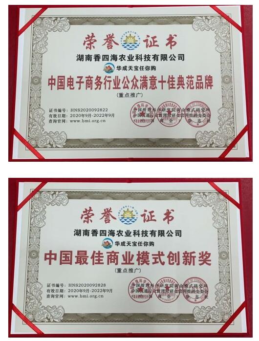 近日,在中国管理科学研究院商业模式研究所、中国流通行业管理政研会信用管理专业委员会、《中国商会》杂志社特组织开展的“行业领导力品牌暨诚信创新企业宣传推介”活动中湖南香四海农业科技有限公司凭借良好的市场信誉和品牌口碑荣获“中国电子商务行业公众满意十佳典范品牌”、“中国最佳商业模式创新奖” 两项大奖。