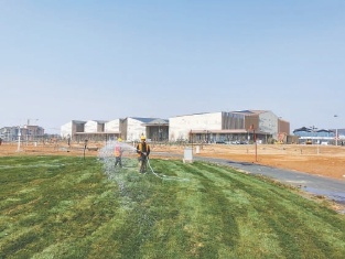 世界休闲领域最具影响力的学术盛会——北京·平谷世界休闲大会将于4月15日-21日在平谷区举办。图为施工人员正在进行外围绿化整修以及景观装饰。 本报记者 甘南摄