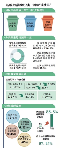 分类设施建设管理达标率由2020年5月份的7%上升至目前的88.8%,投放站点脚踏、拉环等便利性设施的配置率达到97.15%。生活垃圾处理能力3.38万吨/日,其中,焚烧能力1.77万吨/日,生化能力8230吨/日,基本满足分类处理需求。