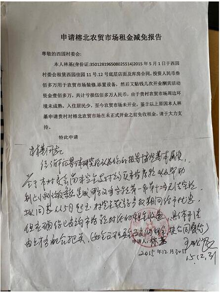因未能开业,林基也没能收取次承租人租金,与此同时,由于投入巨额资金营销,造成他资金周转严重困难。2015年12月,林基向西园村委会提交了书面申请,陈述了投入100多万元,亏损500多万元的困难,申请在全面开业之前免收租金。在林基递交申请翌日,西园村委会给予了书面答复,同意从当年5月起至村委会完全获得该场地产权期间给予优惠,在农贸市场全面开业后全面缴纳租金,但应确保投资入股的7名村民的租金收益。
