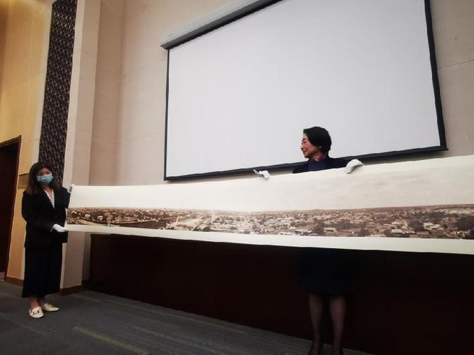 当日捐赠的“民国初年北京城360度全景照”巨型照片(局部)(新华社记者赵琬微 摄)