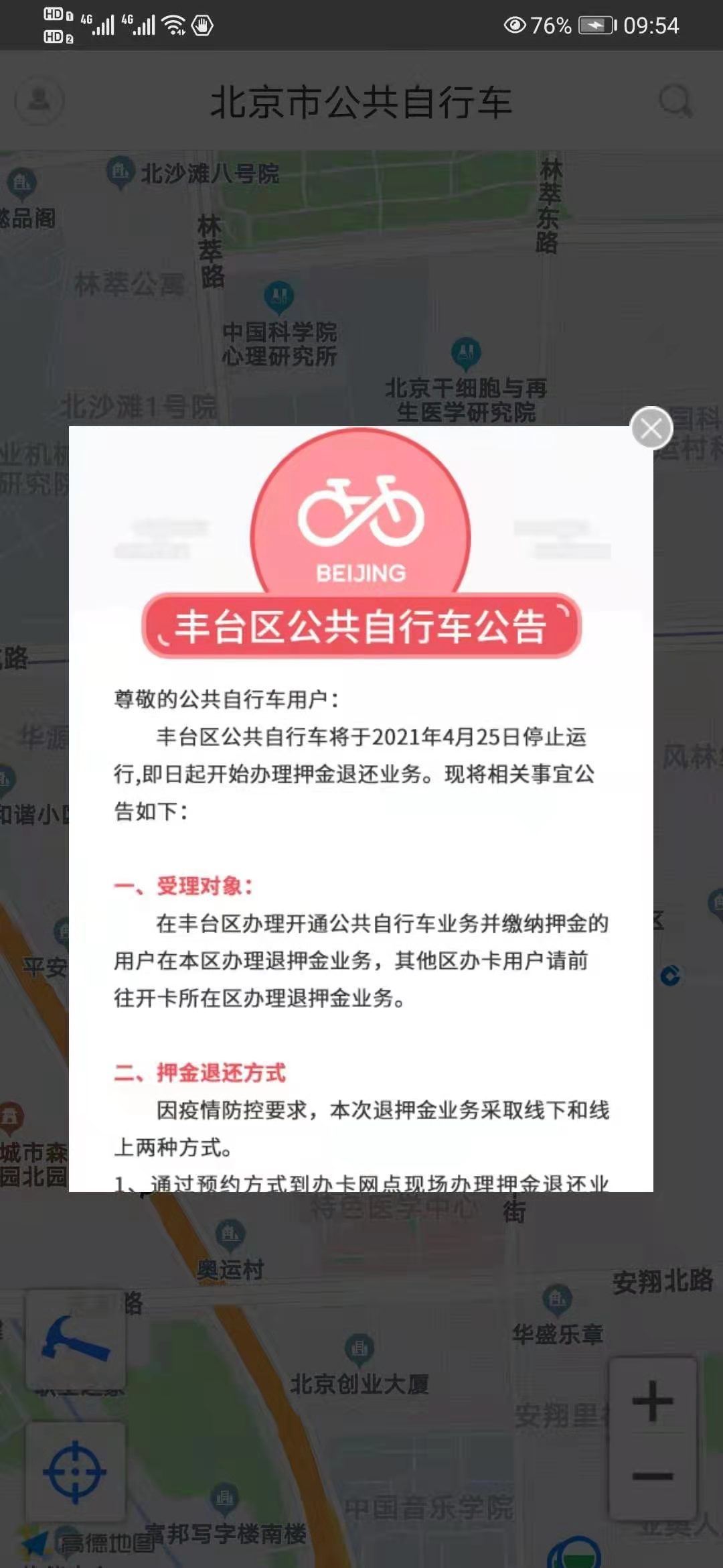 打开北京市公共自行车app,立刻弹出了丰台区公共自行车停止运营的公告。在北京市交通委员会官网的北京公共自行车服务公告一栏下,西城区、东城区、海淀区和石景山区公共自行车停止运营的公告排了一长串。