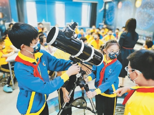 教学楼里,学科老师讲授课本外的知识,学生们听得兴致勃勃。天文社团教室里,学生们利用球幕设备仰望“星空”,学习鉴别陨石标本,合作组装天文望远镜。一位小学员说:“有时候老师会带我们去户外观星,我很想学习天文摄影。”连环画社团的活动教室里,学生们手持画笔,还原电影《闪闪的红星》中的经典场面。美术学科教学主任安明说,最终学生们的画会拼凑成一本连环画,整个过程既培养了学生的美术素养,也提高了语文学科能力。