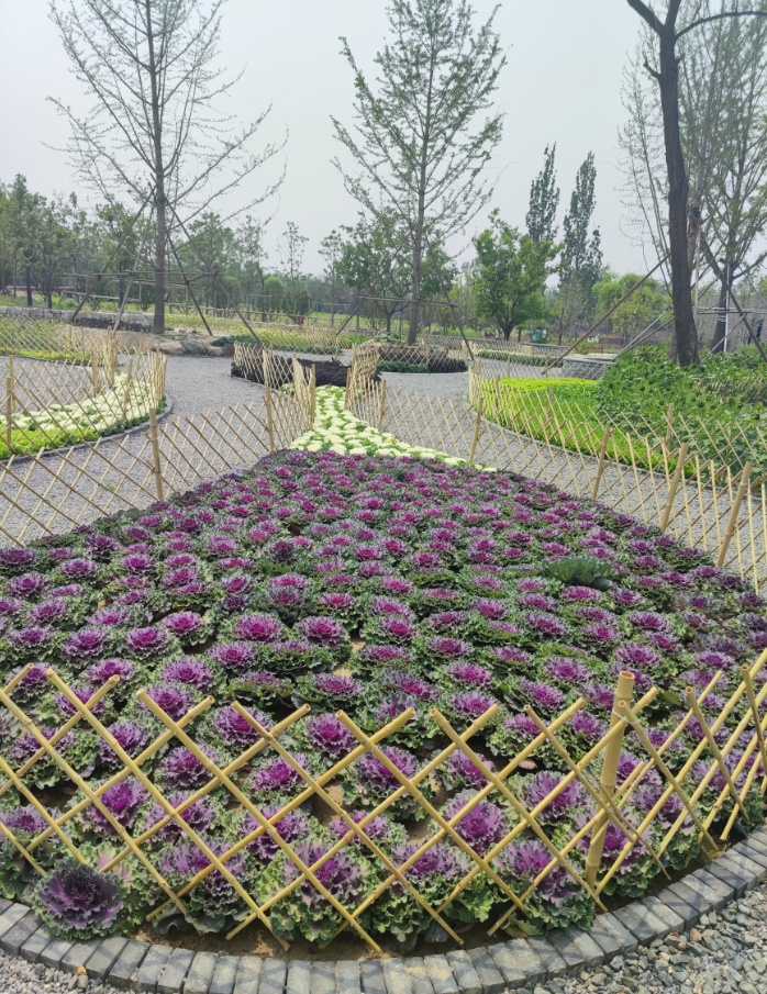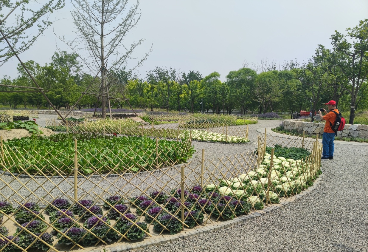 从温榆河公园3号门进入,顺着路标就能找到“东囿云稼”景区。6000平方米的小菜园里,种植的蔬菜高矮错落、生机勃勃。黄色的茼蒿花和油菜花在微风的吹拂下“起舞”,白的、紫的羽衣甘蓝,紫色的京羽紫,绿色的生菜、油菜构成了色彩丰富的景观带。菜园旁,北京市农业技术推广站蔬菜作物科副科长王帅正细细查看蔬菜的长势。